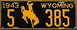 1943 | Embossed golden yellow serial and Bucking Horse and Rider on black plate with border line; "1943 WYOMING" at top | 1-12345 10-1234 |