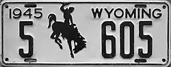 1945 | Embossed black serial and Bucking Horse and Rider on white plate with border line; "1945 WYOMING" at top | 1-12345 10-1234 |