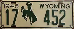 1946 | Embossed green serial and Bucking Horse and Rider on beige plate with border line; "1946 WYOMING" at top | 1-12345 10-1234 |