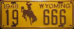 1948 | Embossed brown serial and Bucking Horse and Rider on golden yellow plate with border line; "1948 WYOMING" at top | 1-12345 10-1234 |