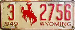 1949 | Embossed red serial and Bucking Horse and Rider on white plate with border line; "1949 WYOMING" at bottom | 1-12345 10-1234 |