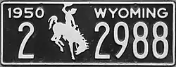 1950 | Embossed white serial and Bucking Horse and Rider on black plate with border line; "1950 WYOMING" at top | 1-12345 10-1234 |