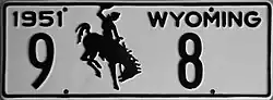 1951 | Embossed black serial and Bucking Horse and Rider on white plate with border line; "1951 WYOMING" at top | 1-12345 10-1234 |
