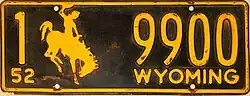 1952 | Embossed yellow serial and Bucking Horse and Rider on black plate with border line; "52 WYOMING" at bottom | 1-12345 10-1234 |