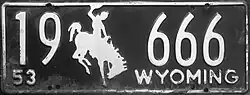 1953 | Embossed white serial and Bucking Horse and Rider on black plate with white border line; "53 WYOMING" at bottom | 1-12345 10-1234 |