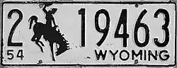 | 1954 | Embossed black serial and Bucking Horse and Rider on white plate with border line; "54 WYOMING" at bottom | 1-12345 10-1234 |