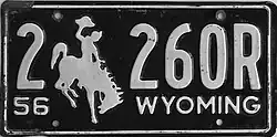 1956 | Embossed white serial and Bucking Horse and Rider on black plate with border line; "56 WYOMING" at bottom | 1-1234 1-123A 1/0-1234 |