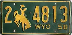 1958 | Embossed yellow serial and Bucking Horse and Rider on green plate with border line; "WYO 58" at bottom right | 1-1234 1-123A 1/0-1234 |
