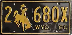 1960 | Embossed yellow serial and Bucking Horse and Rider on black plate with border line; "WYO 60" at bottom right | 1-1234 1-123A 1/0-1234 |