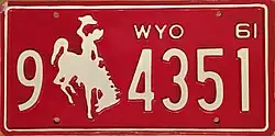 1961 | Embossed white serial and Bucking Horse and Rider on red plate with border line; "WYO 61" at top right | 1-1234 1-123A 1/0-1234 1/0-123A |