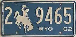 1962 | Embossed white serial and Bucking Horse and Rider on Columbia blue plate with border line; "WYO 62" at bottom right | 1-1234 1-123A 1/0-1234 1/0-123A |