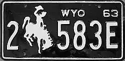 1963 | Embossed white serial and Bucking Horse and Rider on black plate with border line; "WYO 63" at top right | 1-1234 1-123A 1/0-1234 1/0-123A |