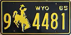 1965 | Embossed yellow serial and Bucking Horse and Rider on black plate with border line; "WYO 65" at top right | 1-1234 1-123A 1-A123 1/0-1234 1/0-123A |