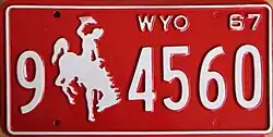 1967 | Embossed white serial and Bucking Horse and Rider on red plate with border line; "WYO 67" at top right | 1-1234 1-123A 1-A123 1/0-1234 1/0-123A |