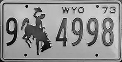 1973 | Embossed black serial and Bucking Horse and Rider on white plate with border line; "WYO 73" at top right | 1-1234 1-123A 1-A123 1/0-1234 1/0-123A |