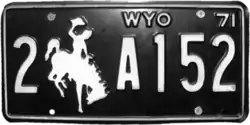 1971 | Embossed white serial and Bucking Horse and Rider on black plate with border line; "WYO 71" at top right | 1-1234 1-123A 1-A123 1/0-1234 1/0-123A |