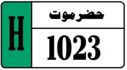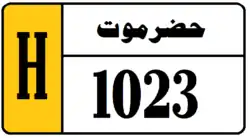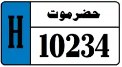 Hadhramaut Governorate License Plates consist of black text and black boundary on white background. Hadramaout Governorate plates consist of the governorate name in Arabic (حضرموت) and a 4 digit number. Hadramaut Governorate plates also have a strip on the left hand side with the letter H in black on a background whose color depends on the classification of the vehicle. Temporary plates have a strip on the right hand side that says "مؤقت", meaning temporary, on a blue background. The license plates for Hadramout use a unique serif font.[4]
