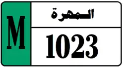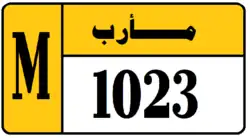 Marib Governorate License Plates consist of black numbers and black boundary on white background. Marib Governorate plates consist of the governorate name in Arabic (مأرب) and a 4 digit number. The governorate name is black on a background whose color depends on the classification of the vehicle. Marib Governorate plates also have a strip on the left hand side with the letter M in black on a background whose color matches the background color governorate name, and depends on the classification of the vehicle. The styles of Marib license plates thus differ from the previously mentioned southern governorates. The letter code used by the governorate, M, is the same as the letter code used by Al Mahrah Governorate. The license plates for Marib use a unique serif font.[6]