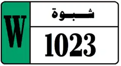 Starting from February 2020, Shabwah Governorate joined with Hadhramaut Governorate in issuing license plates in this new format and appearance. Similar to Hadhramaut, Shabwah License Plates consist of black text and black boundary on white background. Shabwah Governorate plates consist of the governorate name in Arabic (شبوة) and a 4 digit number. Shabwah Governorate plates also have a strip on the left hand side with the letter W in black on a background whose color depends on the classification of the vehicle. Temporary plates have a strip on the right hand side that says "مؤقت", meaning temporary, on a blue background. The license plates for Shabwah use a unique serif font.[7]