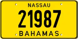 The Bahamas requires its residents to register their motor vehicles and display a vehicle registration plate.[1] Current plates are North American standard 6 in × 12 in (152 mm × 300 mm).[2] The configuration of the plates is two letters followed by four numbers. At the bottom of the plate is the flag of the Bahamas.[3]