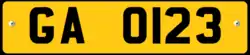 52 cm x 11 cm Black on yellow Gambian Flag as well as the text GPF on the top left corner of the license plate |