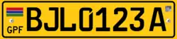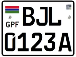 Registration plates of the Gambia have, since 2019 have been coloured yellow or white with black lettering. To the left is the Gambia flag and the letters "GPF". The plates are in the standard European size, and feature the German FE font. The first set of letters denote the city of issue, such as BJL for Banjul.