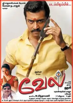 Vel (/veɪl/ transl. Spear) is a 2007 Indian Tamil-language action drama film directed by Hari and produced by M. Chinthamani under Sree Rajakaalaiamman Medias. It stars Suriya in dual lead roles, alongside Asin, Vadivelu, Kalabhavan Mani, Nassar, Charan Raj, Lakshmi, Saranya Ponvannan and Ambika.[1] The music, cinematography and editing were handled by Yuvan Shankar Raja, Priyan and V. T. Vijayan.[2]