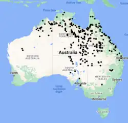 Velesunio wilsonii mussels are distributed throughout several areas of Australia.[5] Velesunio wilsonii can be found in the Northern Territory, Western Australia, Queensland, northeast of South Australia and northern New South Wales.[6] There are no records of Velesunio wilsonii in Victoria or Tasmania.[3]