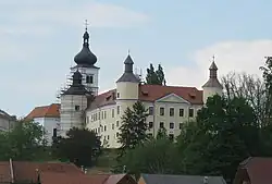 It is dominated by Velika Nedelja Castle and the neighbouring parish church. The castle originates in the 13th century and was rebuilt and expanded in the 17th and 18th centuries and renovated in 1989. It has an internal courtyard with a well and rounded turrets on the corners of the two-storey main building. It houses the local archive and a small museum.[3] The church next to it is dedicated to the Holy Trinity and belongs to the Roman Catholic Archdiocese of Maribor. It is an originally Romanesque single-naved building with a belfry and 18th-century Baroque additions. Some Romanesque sculpture is preserved on the facade and the interior of the church.[4]