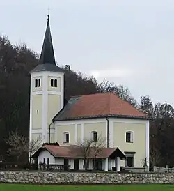 The local church is dedicated to Saint Martin and belongs to the Parish of Žalna. It is originally a 14th-century Gothic building that was heavily remodeled in the Baroque style in the 18th century.[10] The church was first mentioned in written sources in 1331. The church has an early Baroque high barrel-vaulted nave complemented by 18th-century altar furnishings. The main altar dates from 1716, and the wall paintings date from the end of the 17th century. A painting of Saint Anne on the north side altar is the work of Franc Jelovšek (1700–1764), the paintings on the south side altar are the work of Matija Koželj (1842–1917), and the Stations of the Cross are works from the school of Leopold Layer (1752–1828).[11] The church is surrounded by a cemetery.