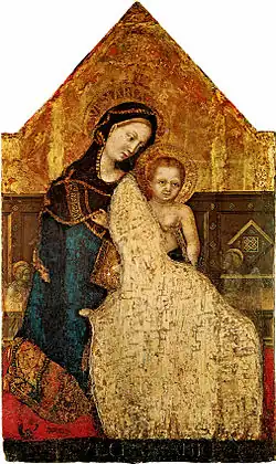 The Velletri Madonna is a tempera and gold on panel painting by Gentile da Fabriano, executed c. 1426-1427, the only surviving work from his stay in Rome (perhaps from 1426 but definitely from 28 January 1427).[1] A Madonna of humility, it was in the church of Santi Cosma e Damiano until 1633 when Ludovico Ciotti di San Paolo, General of the Third Order Franciscans, donated it to the Church of Sant'Apollonia in Velletri. It is now in the Diocesan Museum in Velletri. A restoration in 1912 restored the top to its original triangular form.[2]