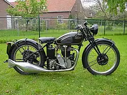 The Velocette KSS is a British motorcycle made by Velocette, a sports roadster in the “K” series of Velocette motorcycles with overhead camshaft engines. The “K “of the model's name was the next letter in the sequence of letters designating the model, after the Model H two stroke. (The letters “I” and “J” were skipped, presumably to avoid confusion with the digit “1”). “SS” stood for Super Sports. It has been suggested that the “K” stood for “camshaft” because of the founder of the company's German origin, but since the German for “camshaft is “Nockenwelle”, this is extremely unlikely. The KSS remained in production in various forms until 1948.[1]