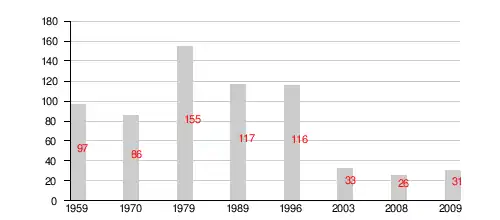 | Year | 1959 | 1970 | 1979 | 1989 | 1996 | 2003 | 2008 | 2009 |