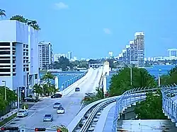 ![]() Venetian Causeway from Downtown Miami, east toward Miami Beach in 2002 | |