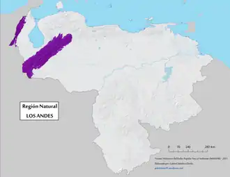 The Venezuelan Andean system represents the terminal bifurcation of the Cordillera Oriental de Colombia, which in Venezuelan territory consists of two mountainous branches: the Sierra de Perijá, smaller, slightly displaced from southwest to northeast with 7,500 km2 in Venezuela; and a larger, frankly oriented Southwest to northeast with about 40,000 km2, the Cordillera de Mérida, commonly known as the proper Venezuelan Andes.[1] The highest point in Venezuela is located in this natural region.[2] It covers around 5.2% of the national territory, being the 4th largest natural region in Venezuela.