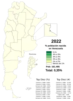 Venezuelan Argentines (Spanish: venezolano-argentinos) are Argentine citizens of predominantly or total Venezuelan descent, or Venezuelan citizens who have migrated to and settled in Argentina. As of 2022, there are 300,000 Venezuelans living in Argentina,[7][2] most of whom migrated during the latter half of the 2010s as part of the Venezuelan refugee crisis.[3][8] The last census held in Argentina, in 2010, registered only 6,000 Venezuelan migrants living in the country.[9]