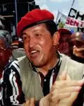 The Chávez platform comprised three basic pledges.[2] First to begin his presidency by abolishing Venezuela's old puntofijismo political system of two-party patronage, and opening up political power to independent and third parties. Second, to end corruption. Third, to eradicate poverty in Venezuela. In working to gain the trust of voters, Chávez drafted an agenda that drew heavily on his interpretation of Bolivarianism.[7][3] Chávez also utilized his charisma and flamboyant public speaking style—noted for its abundance of colloquialisms and ribald manner—on the campaign trail to help win the trust and favor of a primarily poor and working class following.[7][8] On one occasion, he threatened to "fry" the heads of his opponents.[9]