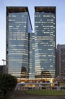 The Ventura Corporate Towers is an office building in the Centro neighbourhood of Rio de Janeiro, Brazil, fronting the avenue between Chile and Lavradio, the street in front of the Rio de Janeiro Cathedral. It was built by Camargo Correa in partnership with Tishman Speyer, who together invested 500,000,000 reais. Designed by Kohn Pedersen Fox Associates, the building has achieved LEED certification, by presenting streamlined and intelligent use of water. Moreover, the special glass provides natural lighting and is not so warm inside the building, reducing expenses with chilled air and light. Together with the Ventura Corporate Tower II, the venture will strengthen the corridor's commercial avenues in Chile, formed by the BNDES, Petrobras, and Caixa Economica Federal. The tower is 140 meters tall, with 36 floors and a heliport.