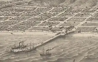 On May 20, 1871, two meetings of San Buenaventura citizens were held at Spear's Hall, one in the morning and a follow-up in the evening, to discuss the construction of a wharf in Ventura. Articles of incorporation and bylaws were adopted to form a company undertaking the project.[15] Joseph Wolfson and his father-in-law Juan Camarillo were principal forces behind the wharf.[16] The wharf was built to promote the city's growth.