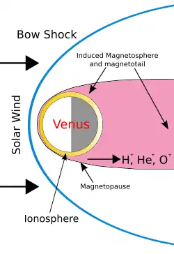 In 1967, Venera 4 found Venus's magnetic field to be much weaker than that of Earth. This magnetic field is induced by an interaction between the ionosphere and the solar wind,[79][80] rather than by an internal dynamo as in the Earth's core. Venus's small induced magnetosphere provides negligible protection to the atmosphere against solar and cosmic radiation.