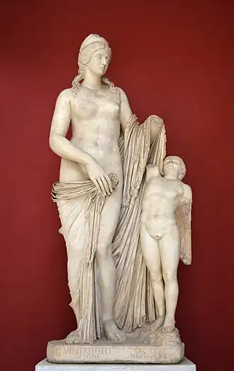 The Venus Felix is a 2.14 meter high marble carving of Venus and Cupid. One of the arms of the Venus, and both of the Cupid's arms, are broken. It is not known when or where the statue was discovered; it is recorded in the papal collections in 1509.[1] In the eighteenth century, the antiquarian Francesco Ficoroni claimed that the Venus had been found near Santa Croce in Gerusalemme, though there is no evidence to support this. The sculpture is sometimes identified as a portrait of Faustina the Younger.[2] On the basis of the inscription, the sculpture was previously identified as depicting Sallustia Orbiana, the wife of the emperor Severus Alexander, though it does not resemble the portraits of her known from coins.[3]