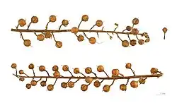 The moth mullein grows a small, simple fruit that is spherical in shape and has a diameter less than 0.5 inches (13 mm). Each fruit is dark brown in color and contains numerous dark brown seeds. The fruit of the mullein develops, matures, and falls from the plant all in the second year of growth. In certain regions of the world, finches have been known to consume and distribute the seeds.[7][10]