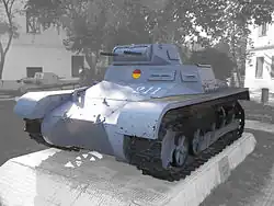 The shortage of armoured forces prompted the Soviet Union to supply the Popular Front and Nazi Germany and Italy to supply the Nationalist Front with light tanks. Between 1936 and 1939, the Germans provided the Nationalists with 122 Panzer Is[13] and the Italians provided 155 L-3-35s.[14] Meanwhile, the Soviets issued Republican Spain 281 T-26s and 50 BT-5s.[15] The Nationalists quickly found out the light machine guns on their tanks could not penetrate the T-26's armor at over 150 metres (160 yd), and Republican tankers could routinely knock out Panzer Is and L-3-35s at ranges of up to 1,000 metres (1,100 yd).[16] In order to re-equip Nationalist armored forces with the T-26, German Major Ritter von Thoma offered Spanish troops 500 pesetas for each tank captured.[17] There were also attempts to up-gun the Panzer I with an Italian Breda 20 millimetre Model 1935 anti-aircraft gun, due to its high Muzzle velocity and low recoil. Despite four successfully converted vehicles, designated Panzer I Breda, there was no widespread program to retrofit the gun into the Panzer I.[18] Instead, the Nationalists began to press captured T-26s into service against their previous owners, with the first Nationalist T-26 unit formed in June 1937.[19]