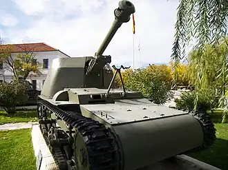 Between the late 1940s and early 1950s there were a number of programs in Spain to develop a self-propelled howitzer based on an existing chassis. For example, during the early 1950s, Spanish engineers attempted to retrofit a R-43 105 millimeters (4.1 inches) L/26 howitzer into a StuG III. This required reconstruction of the turret's casemate, in a fashion similar to the Verdeja 75-millimeter self-propelled howitzer. Although one vehicle began conversion, the program was never finalized. There were similar programs to fit an 88-millimeter L/56 and a 122-millimeter L/46 howitzer thereafter, but these did not advance beyond the planning stage, either.[41] One of the most successful programs was the attempt to produce a 75-millimeter self-propelled howitzer based on the chassis of the Verdeja 1 prototype. Beginning in 1945,[42] now-Major Verdeja was ordered to begin designing this piece using a rapid-firing 75-millimeter L/40 howitzer designed by Sociedad Española de Construcción Naval.[43] The availability of the required parts and the lack of complicated changes meant that the vehicle was quickly prepared and tested extensively. The fate of the self-propelled piece was much the same as that of the Verdeja 2, and the vehicle was left untouched at the proving grounds in Carabanchel until 1973, when it was moved to the Spanish base Alfonso XIII, housing the then Mechanized Infantry Regiment Wad Rass nº 55. It was soon moved to another base, and finally delivered to the base of El Goloso, outside of Madrid, as a part of an armored vehicles museum.[44]