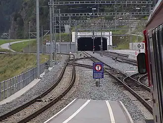 Service is based on hourly regional trains between Scuol-Tarasp and Chur, complemented every 30 minutes by car shuttle trains transporting road vehicles between the two valleys linked via the tunnel and by freight trains. The tunnel is single track, with passing loops (each 2 km (1.2 mi) long) in the middle and near the two portals. Electrification is the RhB overhead standard of 11 kV 16.7 Hz AC. Due to its length, the spatial effects of the Vereina Tunnel have been subject to studies.[7] Since its completion, multiple safety-related modifications to the tunnel have been performed, largely due to changes in standards that have elevated safety requirements.[8] During the 2010s, the Zurich Electricity Works established a district-heating network adjacent to the tunnel that primarily uses water drawn from area around the north portal for geothermal energy.[9]