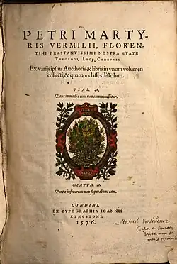 Vermigli is best known for the Loci Communes (Latin for "commonplaces"), a collection of topical discussions scattered throughout his biblical commentaries.[92] The Loci Communes was compiled by Huguenot minister Robert Masson and first published in 1576, fourteen years after Vermigli's death.[93] Vermigli had apparently expressed a desire to have such a book published,[94] and it was urged along by the suggestion of Theodore Beza.[95] Masson followed the pattern of John Calvin's Institutes of the Christian Religion to organise it.[94] Fifteen editions of the Loci Communes between 1576 and 1656 spread Vermigli's influence among Reformed Protestants.[96] Anthony Marten translated the Loci Communes into English in 1583, adding to it considerably.[97]