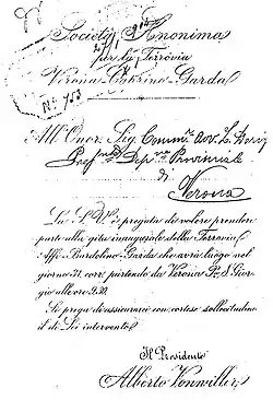 In October 1886, the "Società Anonima per la Ferrovia Verona-Caprino-Garda" (FVCG) was established, with headquarters in Milan and management in Verona, in order to raise the funds for construction and operation: the company had a share capital of 2,500,000 lire and was chaired by banker Alberto Vonwiller, while Achille Levi was vice-president; among the directors were Serafini, Camis and Luzzato.[4] The magnitude of the expenses envisaged for the construction of the work explains why it was necessary to resort to non-Veronese capital: at that time Verona was experiencing a period of economic and industrial backwardness[note 3] and there was no entrepreneurial class capable of investing such large amounts of capital in such a work. Furthermore, the still-present "military servitudes"[note 4] did not favor the development of industry, as had been the case in Lombardy for some time.