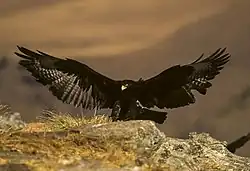 Verreaux's eagle (Aquila verreauxii) is a large, mostly African, bird of prey. It is also called the black eagle, especially in southern Africa, not to be confused with the black eagle (Ictinaetus malayensis) of south and southeast Asia.[2] The Verreaux's eagle lives in hilly and mountainous regions of southern and eastern Africa (extending marginally into Chad, Mali and Niger), and very locally in the Middle East.
