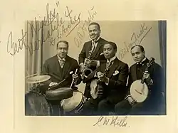 In February 1916, they made their first recordings, including a version of Wilbur Sweatman's "Down Home Rag" released on the "His Master's Voice" label. The band comprised Haston and Tuck on banjolins, Mills on piano, and Johnson on snare drum and woodblock.[2] Sweatman's biographer Mark Berresford wrote that, led by Haston, they "turn in an extremely lively, nay rowdy, performance... in a style that is a fascinating amalgam of country string band and Clef Club banjo orchestra, complete with shouted encouragements to both the imaginary dancers and to one another, and overzealous percussion from drummer Charlie Johnson. The wildness and abandon of the performance is capped by the shouted exclamation by Haston of 'Howww's that?' after the final cymbal crash".[5][6] "Down Home Rag" has been said to have "a credible claim... as the first jazz record", pre-dating recordings by the Original Dixieland Jazz Band by several months.[7] At the same session they also recorded "Circus Day in Dixie", described by music historian David Wondrich as "...with its minstrel themes transformed by pure musical testosterone.. one of the hottest records I've ever heard."[8]