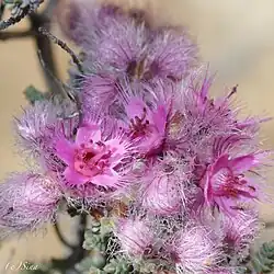 The flowers are sweetly scented and are arranged in spike-like groups, each flower on a spreading stalk 2–3.5 mm (0.08–0.1 in) long. The floral cup is a top-shaped, about 2.5 mm (0.1 in) long, 5-ribbed and glabrous with rounded green appendages. The sepals are 3–4 mm (0.1–0.2 in) long, pale pink to magenta-coloured and have between 5 and 7 hairy lobes. The petals are a similar colour to the sepals, 4–5 mm (0.16–0.20 in) long and have a fringe a further 2.5–3 mm (0.098–0.12 in) long. The style is 5–6 mm (0.20–0.24 in) long, curved and has a tuft of hairs near the tip. Flowering time is from late October to December.[2]